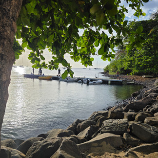 to the the smaller section of the anchorage and tried to drop anchor three times, but it wouldn't grab. After moving to the front of the larger section, we grabbed on the first try. We tidied up quickly and dinghyed into town. The dinghy dock was broken but we were able to use it anyway. We walked around town and found a place for lunch. The next day we searched for a grocery store in the "village", which turned out to be a tourist shopping area. Maggie found a restaurant with free wifi, so she sat there for hours, working out her plans for the St. Thomas/St. John portion of her trip. When she finished her work, she joined me in a little shopping. Since Tim went back to the boat earlier, we called him for a pickup. Dinner and bedtime came quickly as we were moving on the following day.